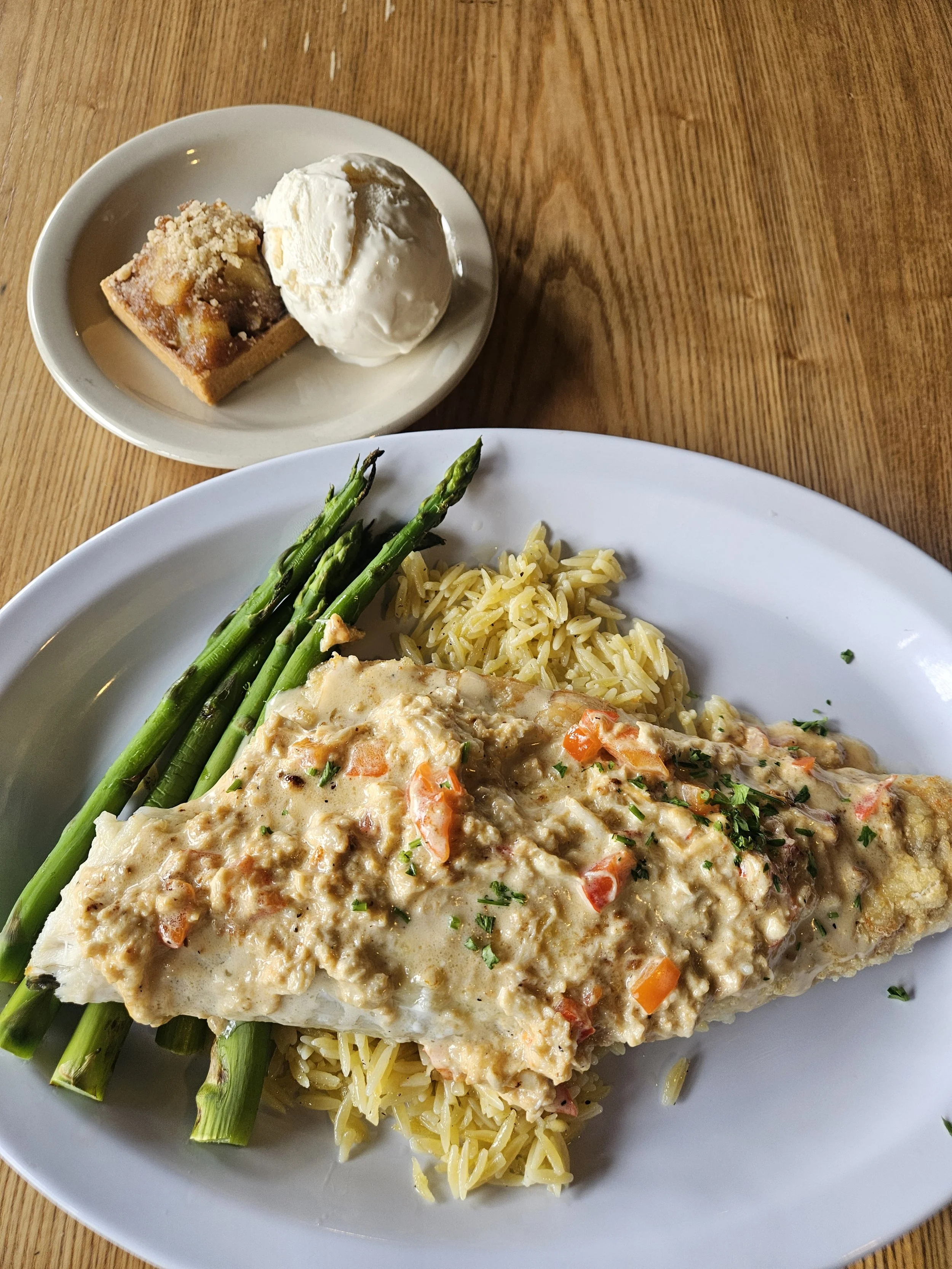 Fresh, local Pan-Fried Rockfish topped with creamy crab scampi, served with lemon-butter orzo, asparagus, and mixed greens & Apple Pie à la mode — all for $26.26.